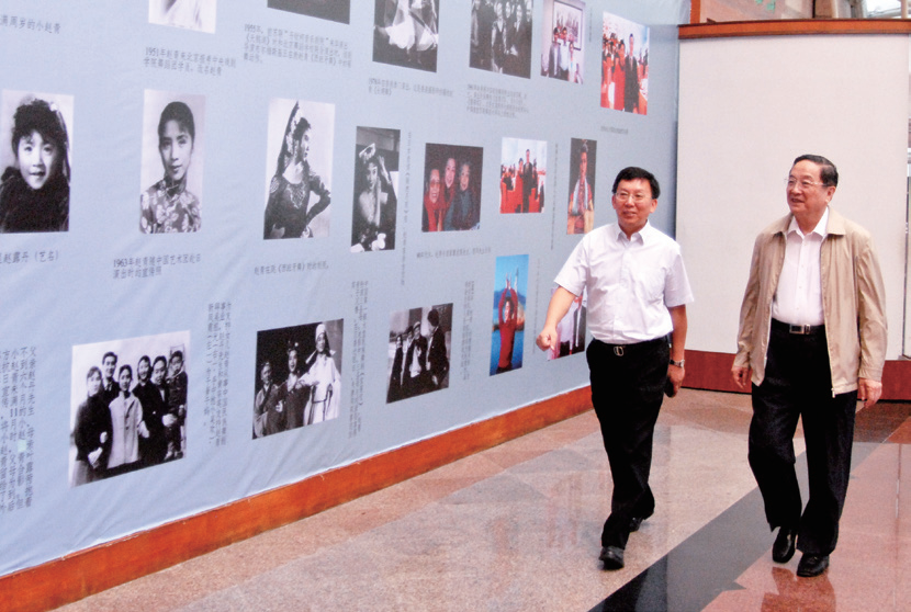 中央政治局原常委俞正声(右一)在刘海粟美术馆原馆长张坚(左一)陪同下观看《丹青熠彩》画展